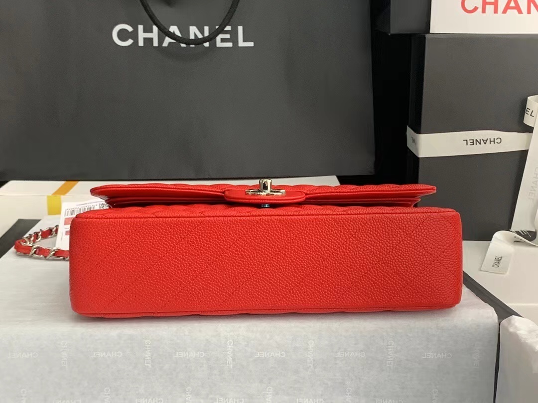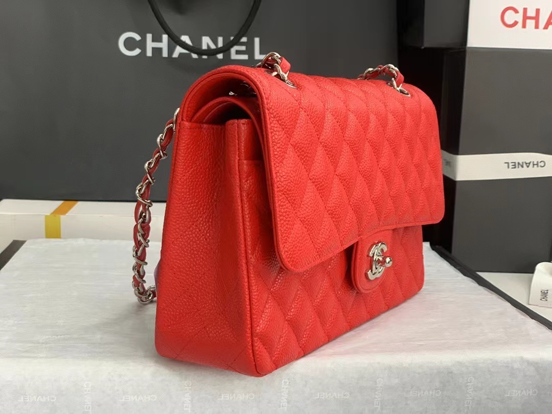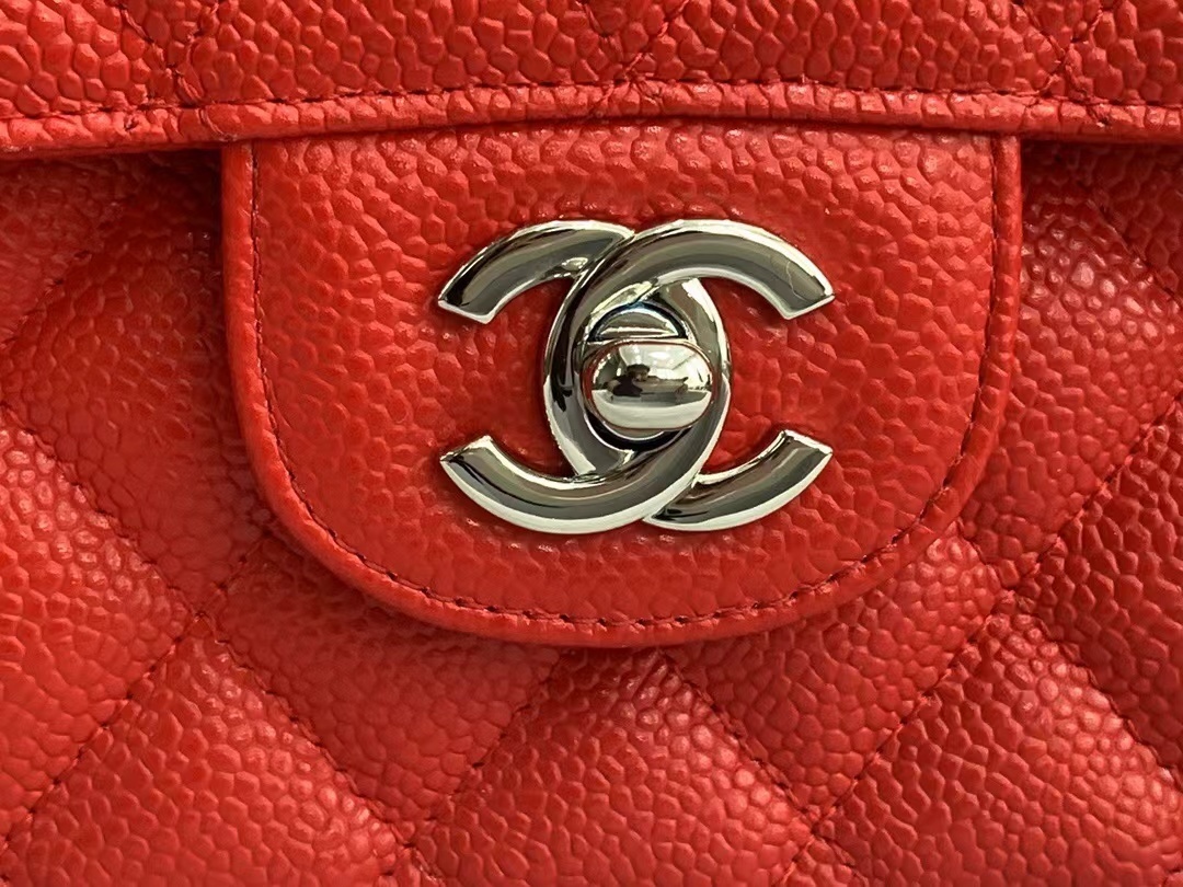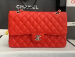 The ultimate icon of timeless Parisian luxury, the Chanel Classic Double Flap Bag is the definitive symbol of elegance, craftsmanship, and enduring style, reimagined here in a vibrant red caviar leather finish. Expertly crafted from premium, durable grained caviar calfskin leather, this legendary handbag features Chanel’s signature diamond-quilted pattern, a timeless design that has defined the house for decades. Anchoring the front flap is the iconic interlocking CC turn-lock closure, an instantly recognizable emblem of Chanel’s heritage and sophistication, finished with polished silver-tone hardware that adds a cool, modern contrast to the bold red hue. Designed for ultimate versatility, the Classic Flap comes with a signature interwoven leather-and-chain shoulder strap, allowing for multiple wearing styles: shoulder carry, crossbody, or even handheld, making it perfect for transitioning seamlessly from work commutes to formal evening events. The double-flap construction opens to reveal a thoughtfully organized interior, offering ample space for all your daily essentials—smartphone, wallet, cosmetics, and keys—while maintaining a sleek, structured silhouette. Finished with precise hand-stitching, durable hardware, and Chanel’s legendary attention to detail, this Classic Flap bag is more than just an accessory; it is a forever investment piece that transcends trends. Its striking red hue and iconic design ensure it will remain a staple in your luxury collection for generations, adding a touch of bold, understated Parisian elegance to any outfit, season after season.