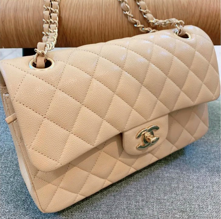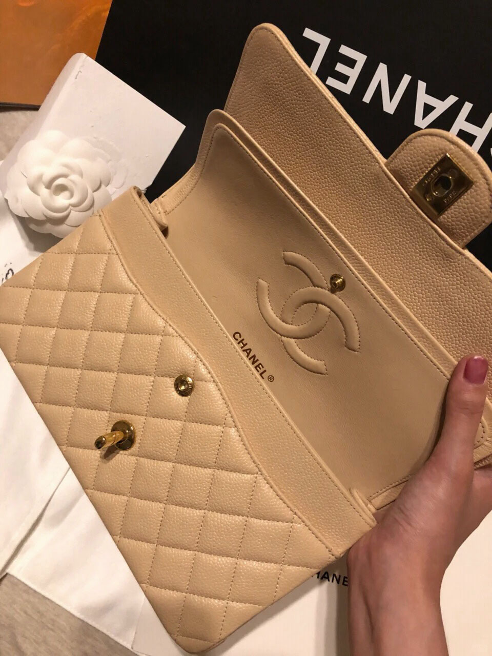 Expertly crafted from premium, durable caviar leather (grained calfskin), this legendary handbag features Chanel’s signature diamond-quilted pattern, a timeless design that has defined the house for decades. Anchoring the front flap is the iconic interlocking CC turn-lock closure, an instantly recognizable emblem of Chanel’s heritage and sophistication, finished with polished gold-tone hardware that adds a luxe, warm glow.