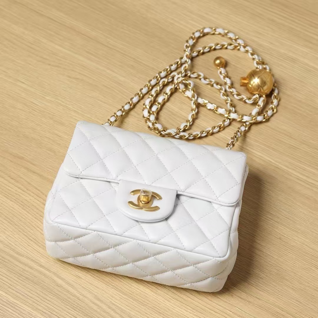 A pinnacle of timeless Parisian luxury, the Chanel Classic Mini Square Flap Bag redefines enduring elegance with its iconic quilted silhouette, elevated here in a crisp white lambskin finish with a playful gold ball charm.