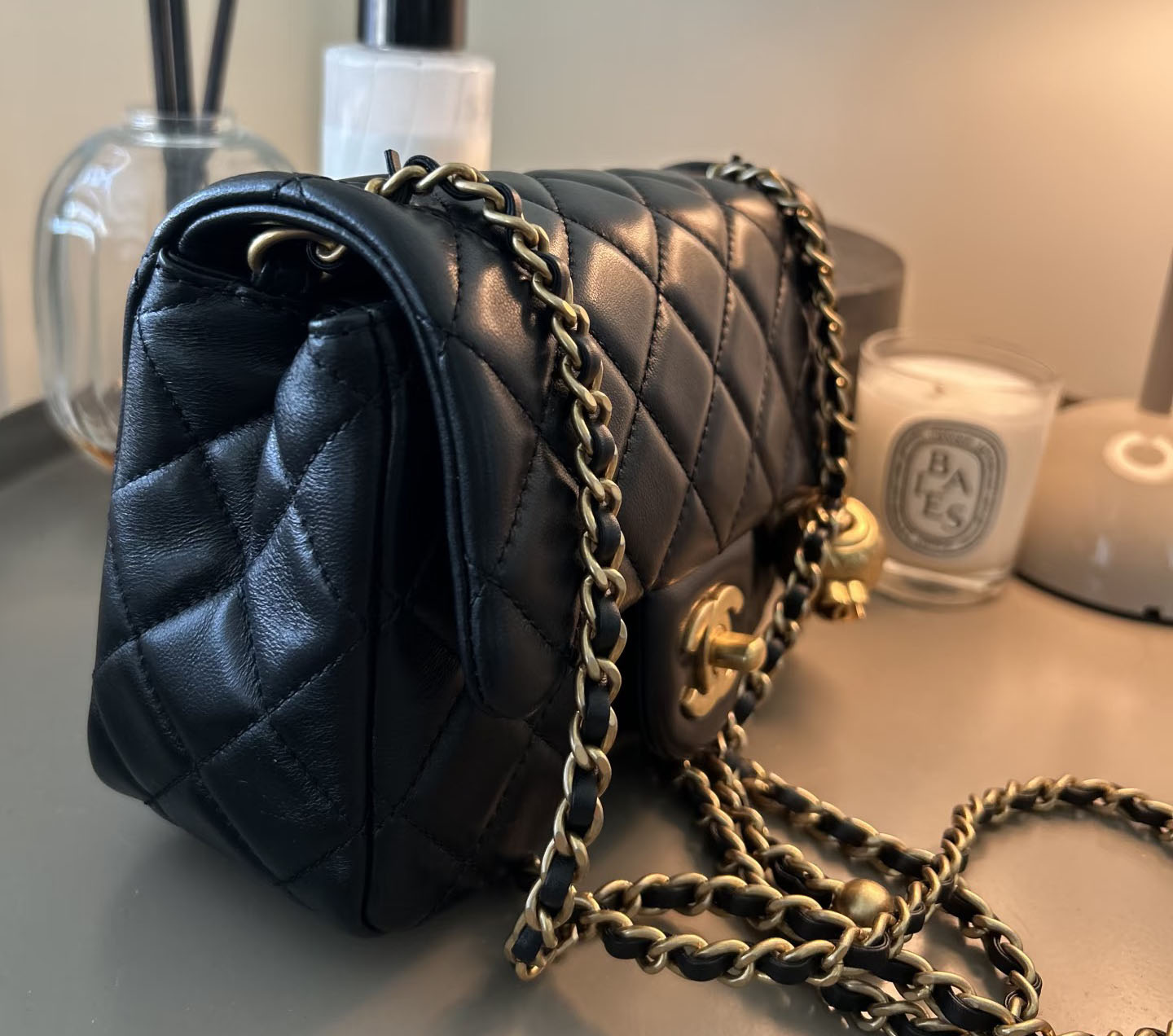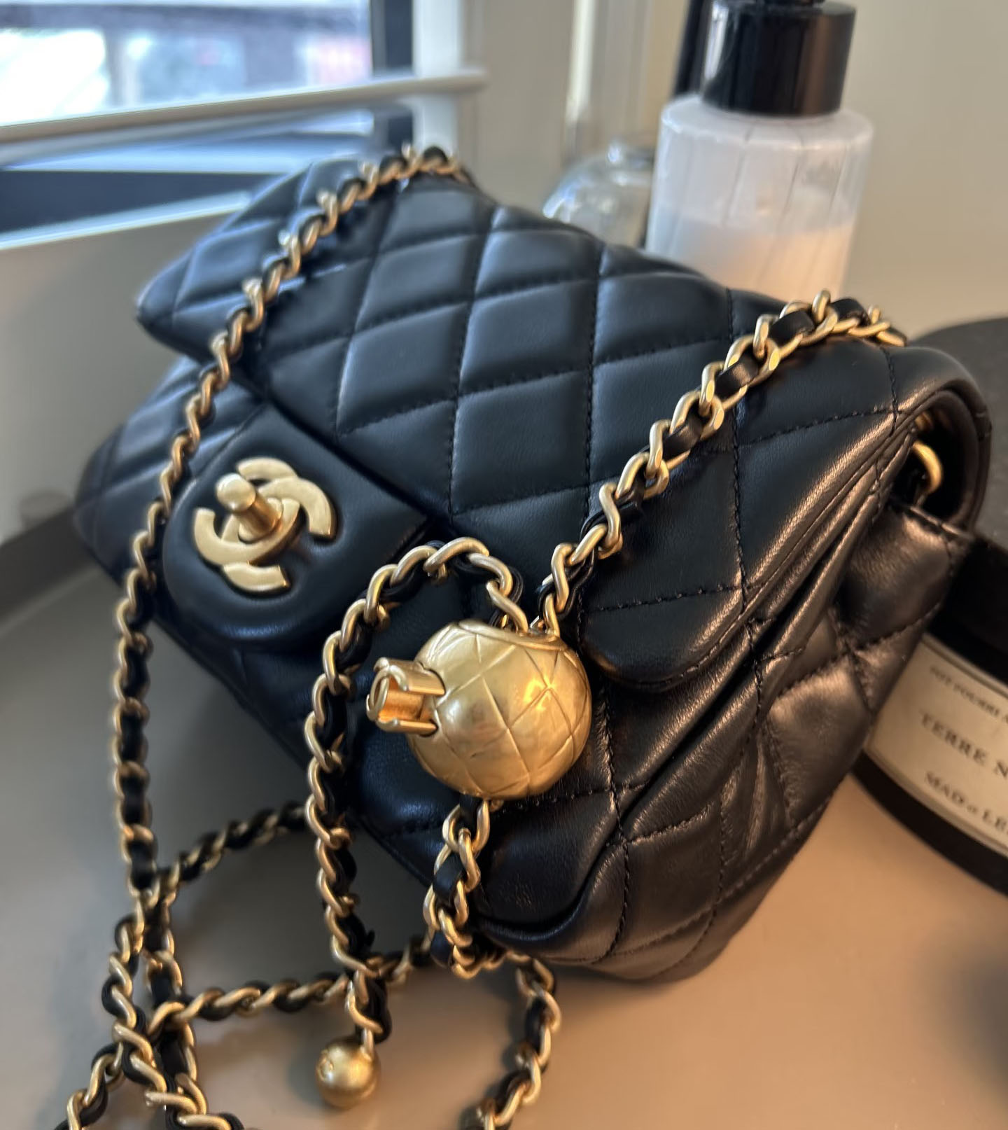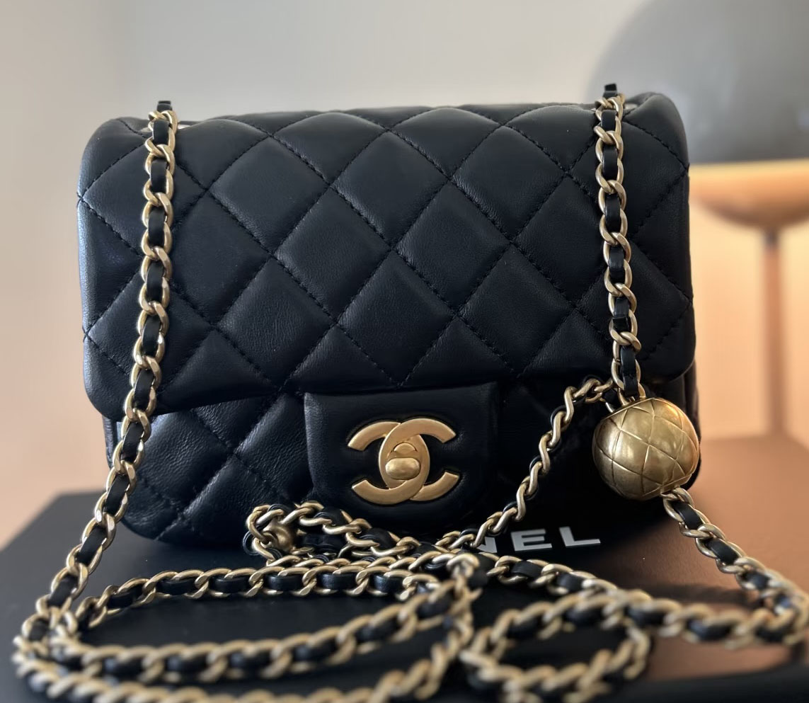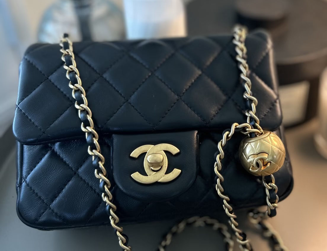 A pinnacle of timeless Parisian luxury, the Chanel Classic Mini Square Flap Bag redefines enduring elegance with its iconic quilted silhouette, elevated here in a sleek black lambskin finish with a coveted gold ball charm. Expertly crafted from premium, buttery-soft lambskin leather, this legendary mini bag features Chanel’s signature diamond-quilted pattern, a design that has defined the house for decades. Anchoring the front flap is the iconic interlocking CC turn-lock closure, an instantly recognizable emblem of Chanel’s heritage and sophistication, finished with polished gold-tone hardware that adds a warm, luxe glow. The standout gold ball charm on the chain strap adds a playful, modern twist to the classic design, making it a highly sought-after collector’s piece. Designed for ultimate versatility, the Classic Mini Flap comes with a signature interwoven leather-and-chain shoulder strap, allowing for multiple wearing styles: shoulder carry, crossbody, or even handheld, making it perfect for transitioning seamlessly from daytime outings to evening events. Its compact, structured silhouette opens to reveal a thoughtfully organized interior, offering ample space for your must-have essentials—smartphone, cardholder, lipstick, and keys—while maintaining a sleek, head-turning profile. Finished with precise hand-stitching, durable hardware, and Chanel’s legendary attention to detail, this Classic Mini Flap bag is more than just an accessory; it is a timeless investment piece that transcends trends. Its timeless black hue and iconic design ensure it will remain a staple in your luxury collection for generations, adding a touch of understated Parisian elegance to any outfit, season after season.