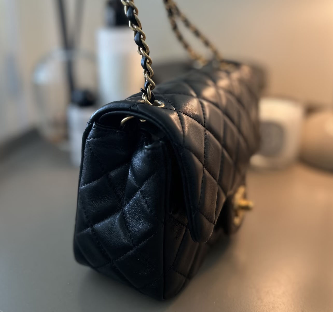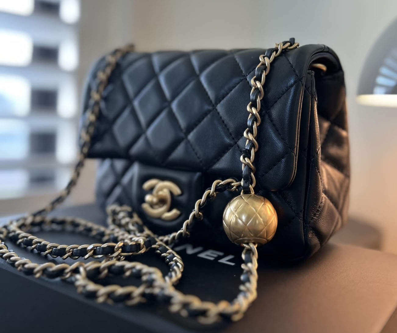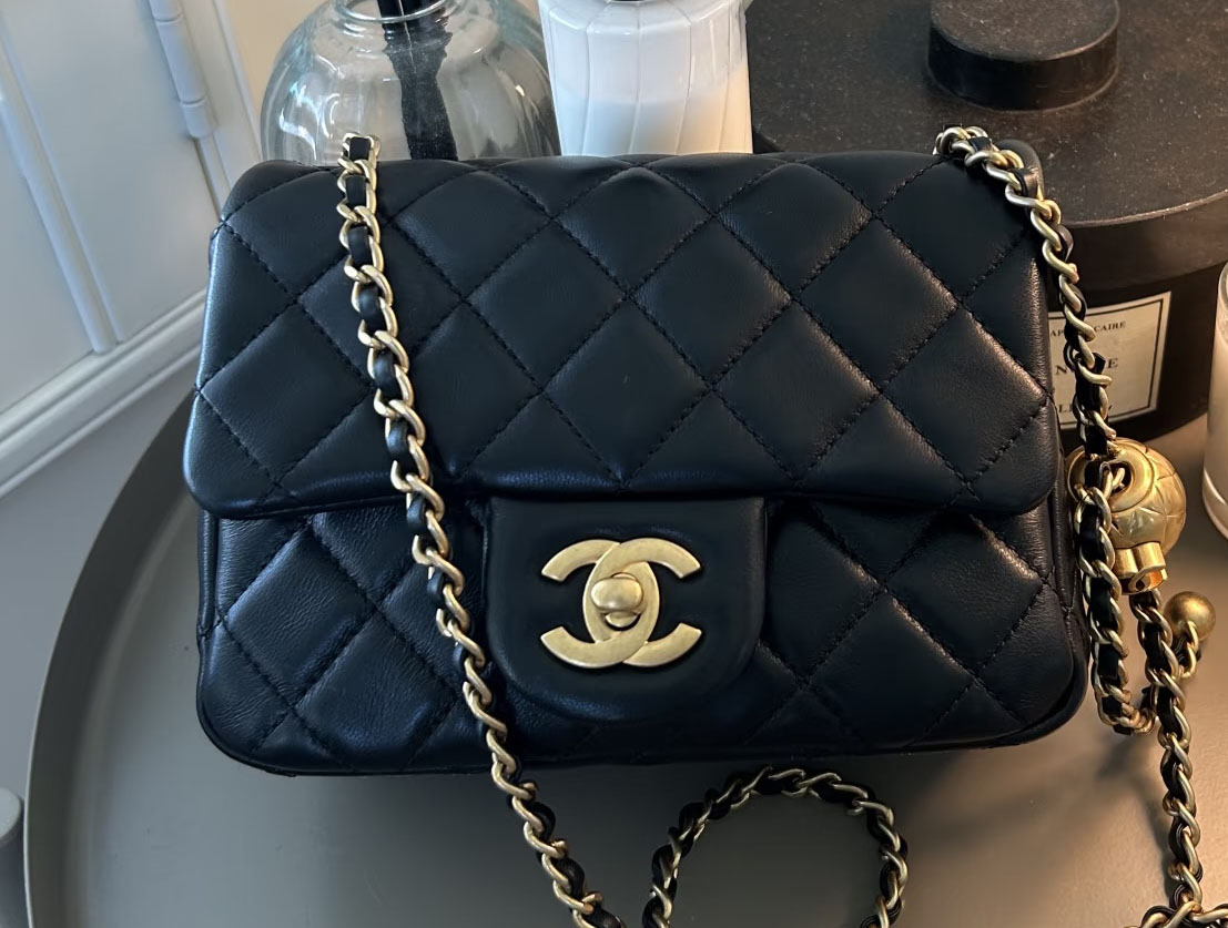 A pinnacle of timeless Parisian luxury, the Chanel Classic Mini Square Flap Bag redefines enduring elegance with its iconic quilted silhouette, elevated here in a sleek black lambskin finish with a coveted gold ball charm. Expertly crafted from premium, buttery-soft lambskin leather, this legendary mini bag features Chanel’s signature diamond-quilted pattern, a design that has defined the house for decades. Anchoring the front flap is the iconic interlocking CC turn-lock closure, an instantly recognizable emblem of Chanel’s heritage and sophistication, finished with polished gold-tone hardware that adds a warm, luxe glow. The standout gold ball charm on the chain strap adds a playful, modern twist to the classic design, making it a highly sought-after collector’s piece. Designed for ultimate versatility, the Classic Mini Flap comes with a signature interwoven leather-and-chain shoulder strap, allowing for multiple wearing styles: shoulder carry, crossbody, or even handheld, making it perfect for transitioning seamlessly from daytime outings to evening events. Its compact, structured silhouette opens to reveal a thoughtfully organized interior, offering ample space for your must-have essentials—smartphone, cardholder, lipstick, and keys—while maintaining a sleek, head-turning profile. Finished with precise hand-stitching, durable hardware, and Chanel’s legendary attention to detail, this Classic Mini Flap bag is more than just an accessory; it is a timeless investment piece that transcends trends. Its timeless black hue and iconic design ensure it will remain a staple in your luxury collection for generations, adding a touch of understated Parisian elegance to any outfit, season after season.