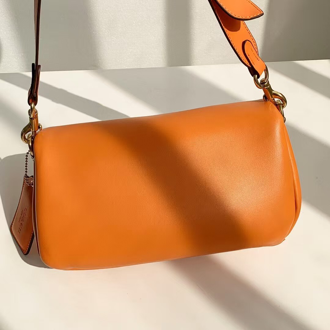 Expertly crafted from premium, durable polished pebble leather, this legendary shoulder bag features Coach’s signature oversized sculpted “C” logo turn-lock closure on the front flap—an instantly recognizable symbol of the brand’s heritage and contemporary style. The vibrant orange hue exudes confidence and warmth, making it a standout statement piece that elevates both casual daytime looks and polished evening ensembles.