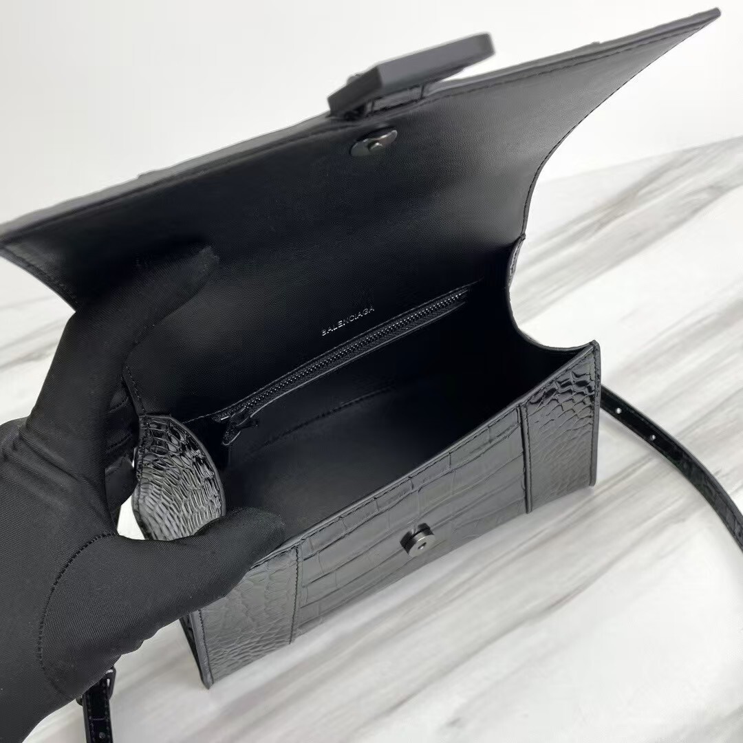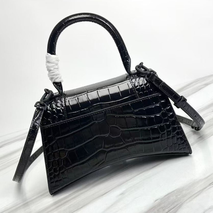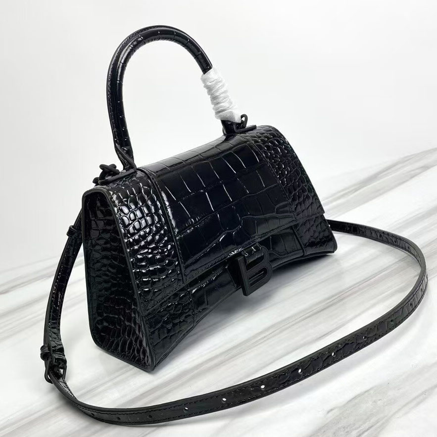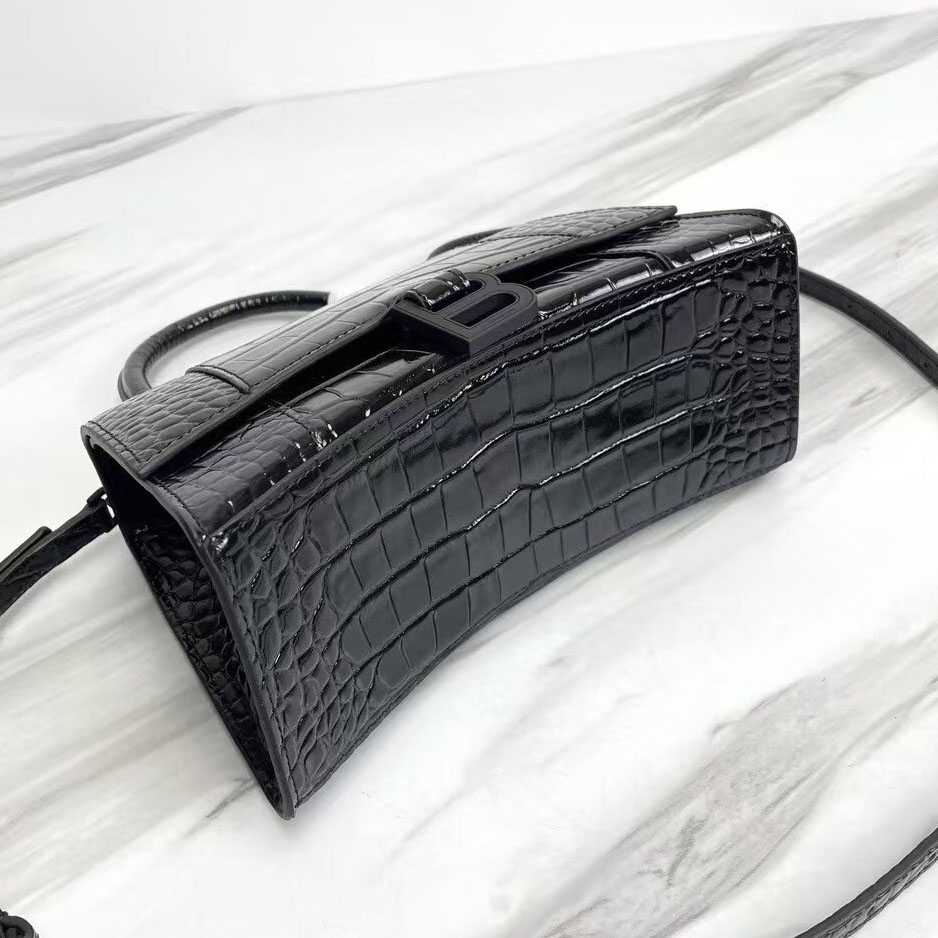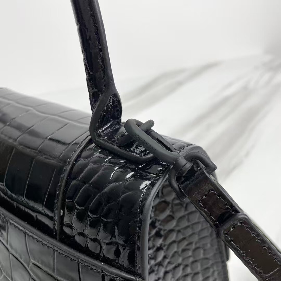 Balenciaga Hourglass Croc-Embossed Black Patent Top Handle Handbag