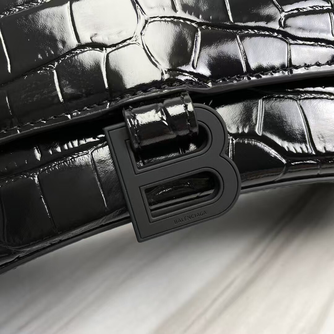 A definitive icon of contemporary luxury, the Balenciaga Hourglass Handbag redefines modern elegance with its sculptural, hourglass silhouette and uncompromising artisanal craftsmanship, elevated here in a sleek black crocodile-embossed patent leather finish.