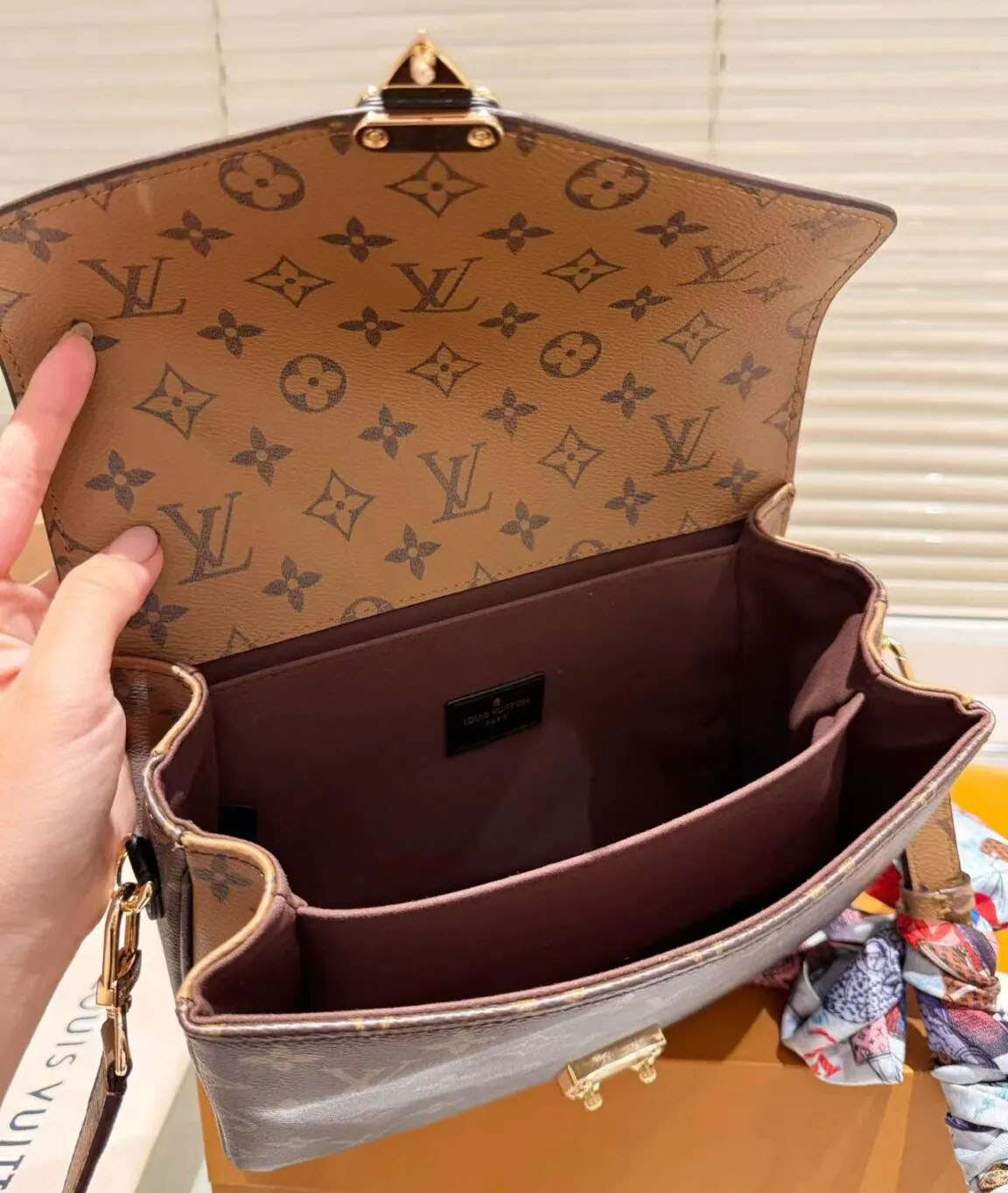 Crafted from Louis Vuitton’s signature coated canvas, this standout style features the iconic Monogram pattern in a reversed colorway: a warm tan Monogram print on the flap, paired with the classic dark brown Monogram on the body, creating a timeless yet modern contrast that instantly elevates any look. Inspired by Louis Vuitton’s 19th-century trunk-making legacy, the bag is finished with the iconic polished gold-tone S-lock closure, a symbol of the brand’s unrivaled craftsmanship and attention to detail.