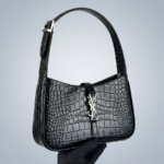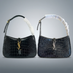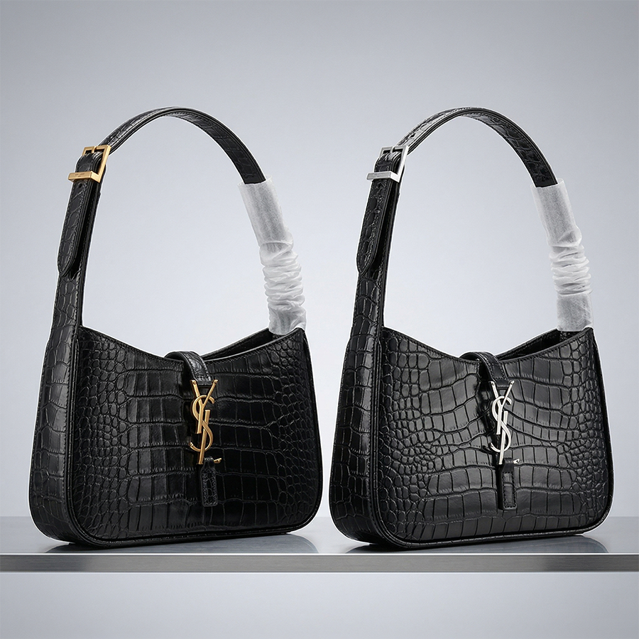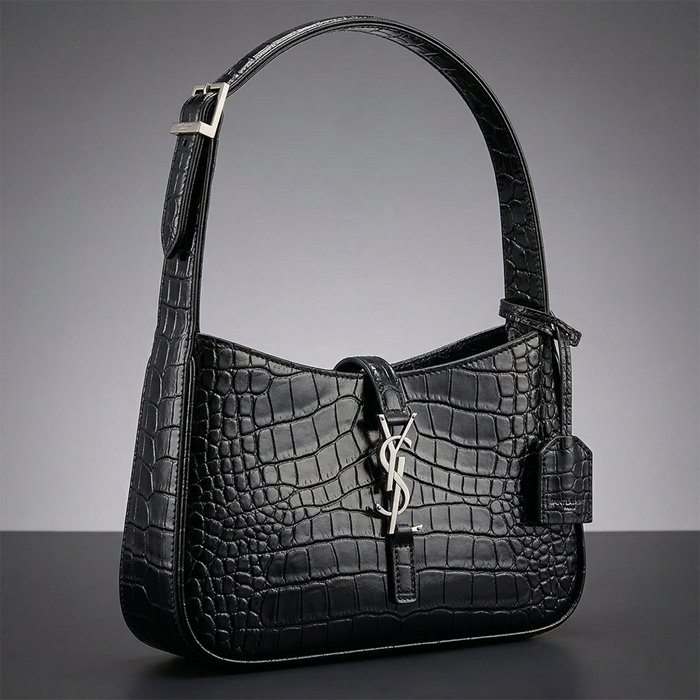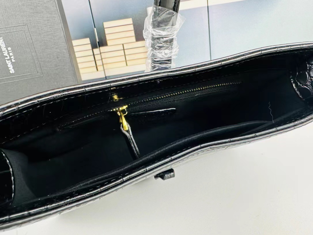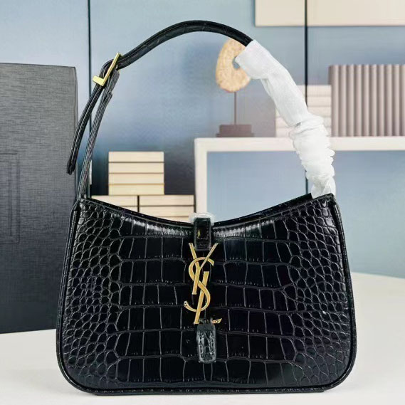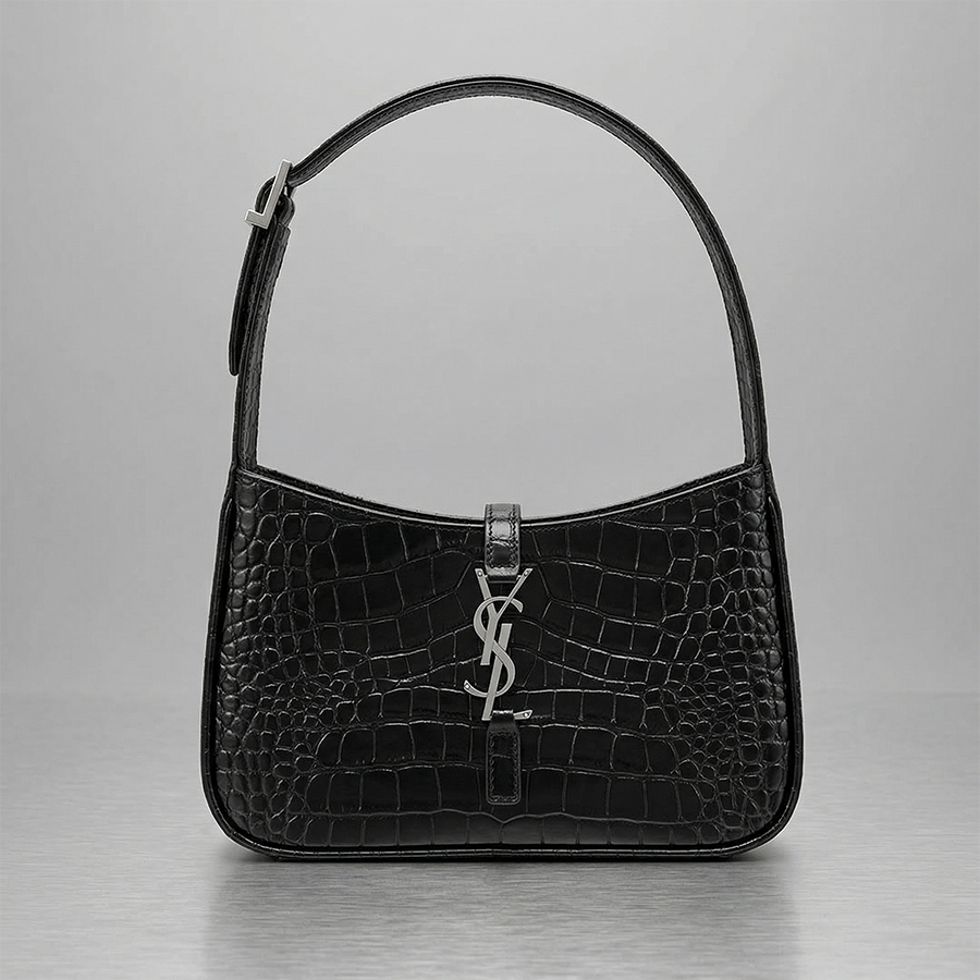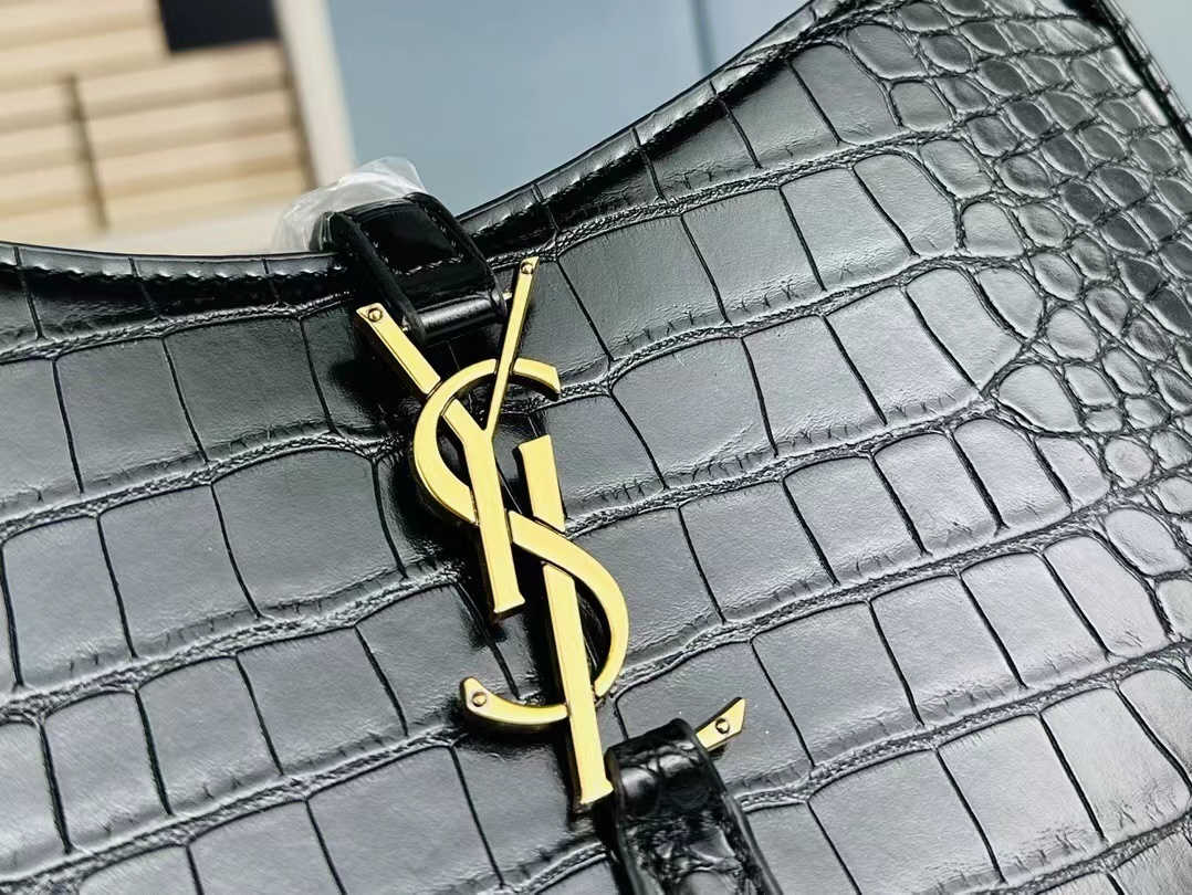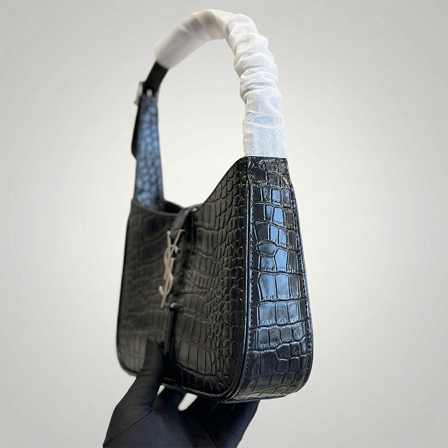 Crafted from premium, glossy leather with a meticulous crocodile-embossed texture, this mini hobo bag exudes opulence with every wear. Its standout feature is the polished gold-tone YSL interlocking logo plaque centered on the front, a bold symbol of Saint Laurent’s legendary heritage. The bag boasts a clean, curved hobo silhouette with a single, structured shoulder strap wrapped in protective plastic (as shown), ensuring it arrives in pristine, unused condition.