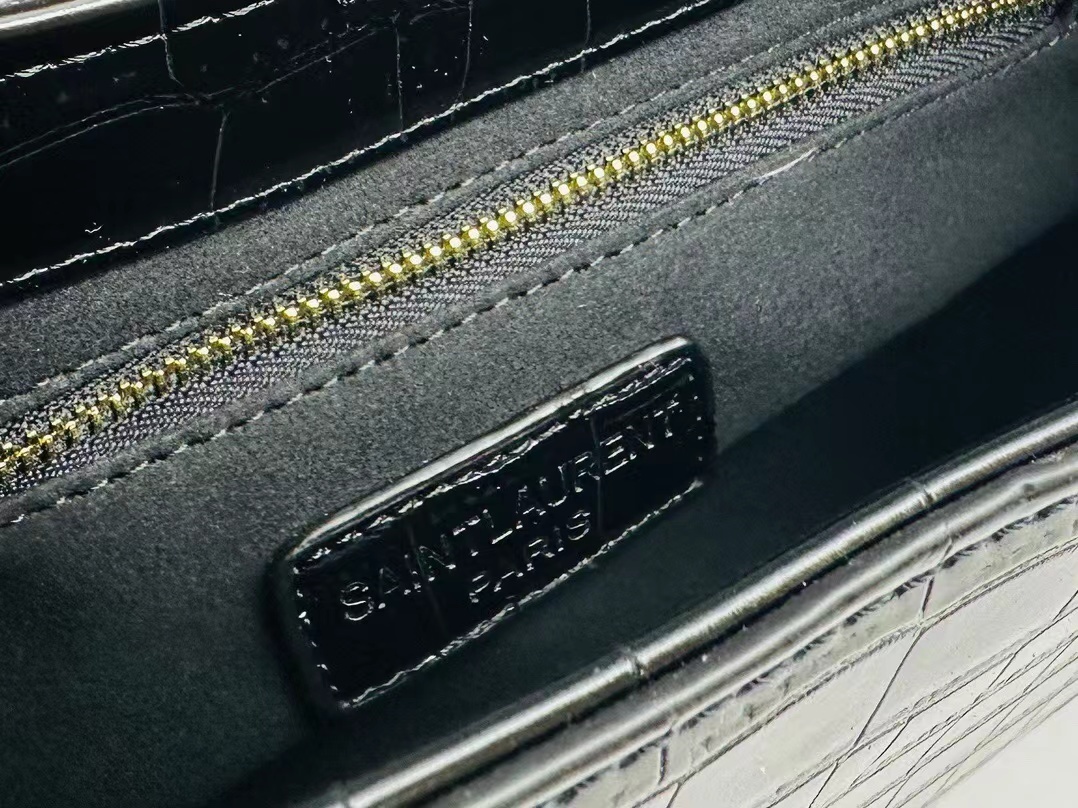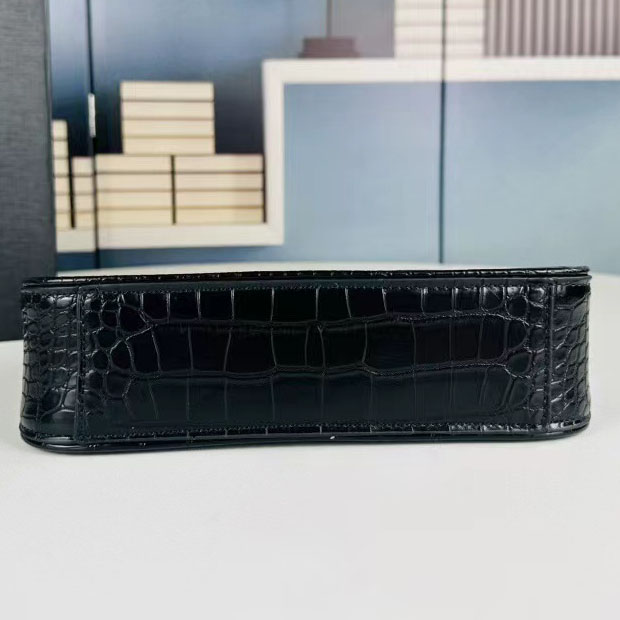 Elevate your luxury repertoire with the iconic Saint Laurent YSL Mini Le 5 À 7 Crocodile-Embossed Shoulder Bag in sleek black with polished gold hardware—a stunning fusion of Sita Sant Laurent’s timeless elegance and modern minimalism.